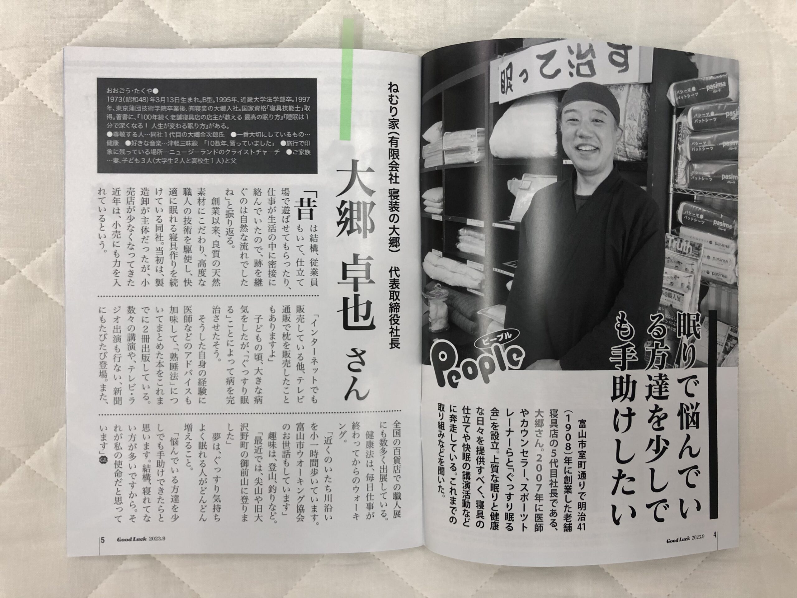 巻頭の[ピープル]のコーナーに、「眠りで悩んでいる方達を少しでも手助けしたい」と題したインタビュー記事が紹介されています。